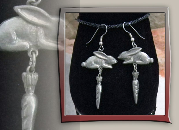 Earrings with bunnies with dangle carrot ornament. Silver color goes with all outfits and especially cute for Springtime or someone who loves rabbits. Price: $7.00 Shipping: $3.00