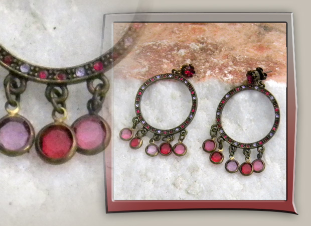 Get your gypsy look going with these stud earrings with hoops of pink, red and orange crystals and glass. Price: $14.00 Shipping: $3.00