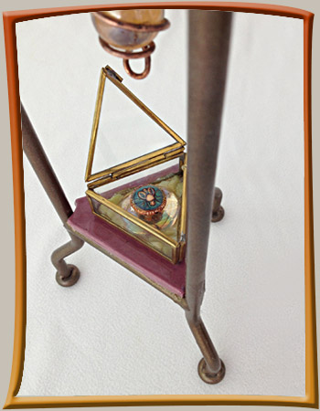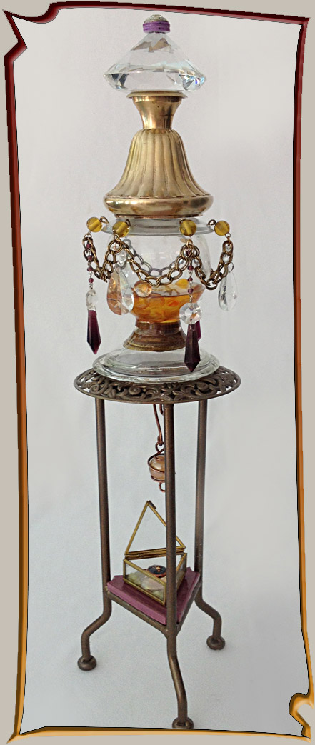 Steampunk-inspired assemblage tower has Victorian flair, includes brass elements, chain and beads. Mysterious charm in box and there are marbles floating in resin inside glass globe. Weird but pretty!