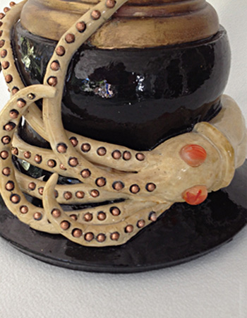 Some handmade ceramics parts, plus found objects. I was in a Steampunk exhibit at Galeria Gitana and found part of me I'd never discovered...the junk collector. The small ship is sculpted to look much like the famous Nautilus in the Disney version of 20,000 Leagues Under the Sea.