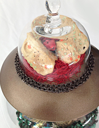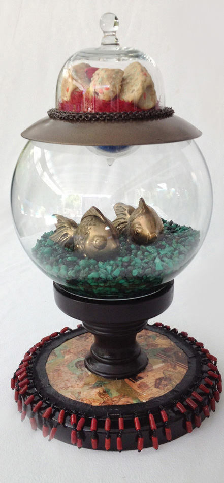 Pair of bronze fish sit in fishbowl with decoupaged base and sushi serving on top. Steampunk, nautical style.
