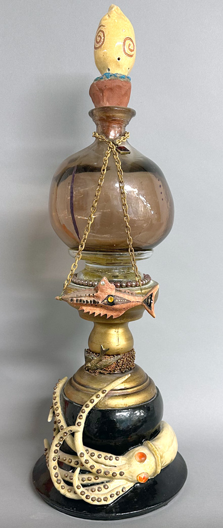 Some handmade ceramics parts, plus found objects. I was in a Steampunk exhibit at Galeria Gitana and found part of me I'd never discovered...the junk collector. The small ship is sculpted to look much like the famous Nautilus in the Disney version of 20,000 Leagues Under the Sea.